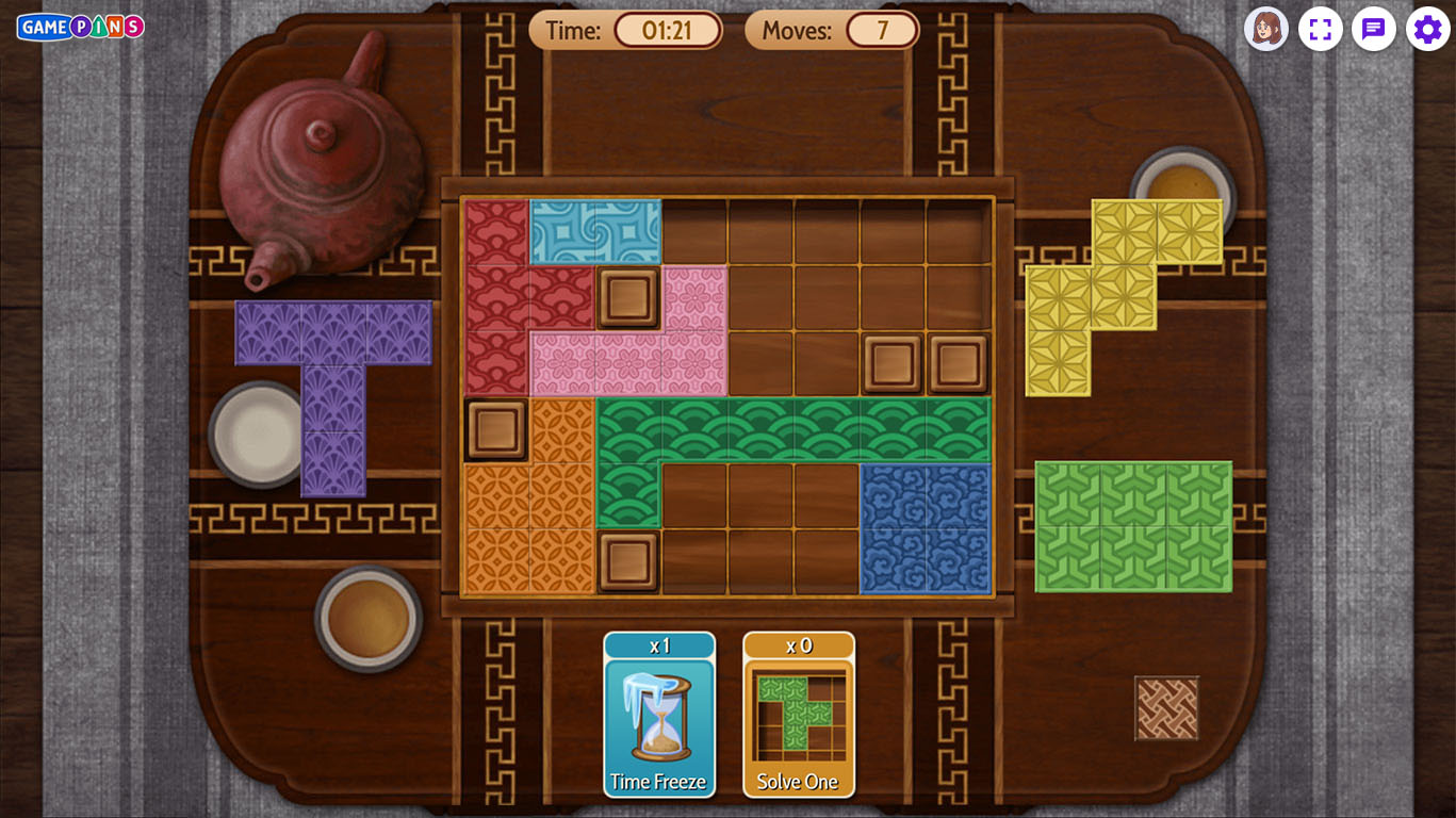 - If you want to solve the puzzle faster, you can use power-ups to freeze the timer or lock a single shape into the correct location.